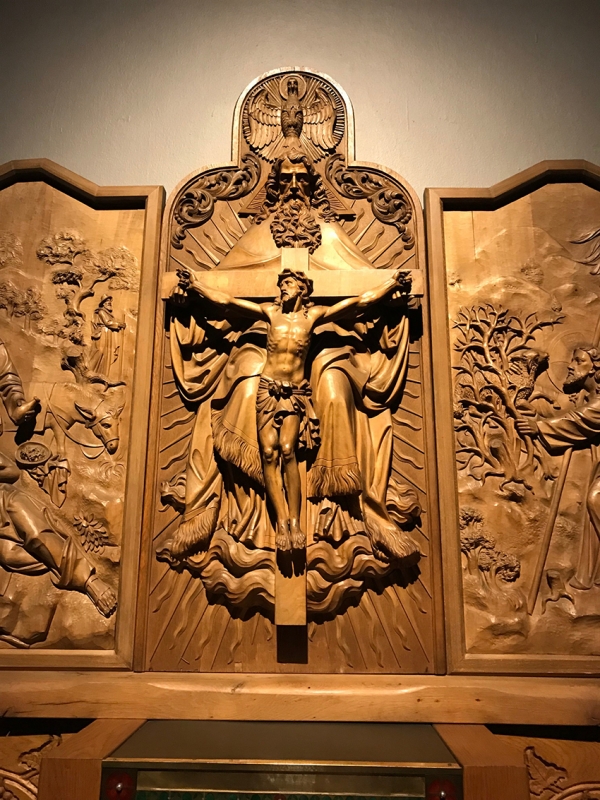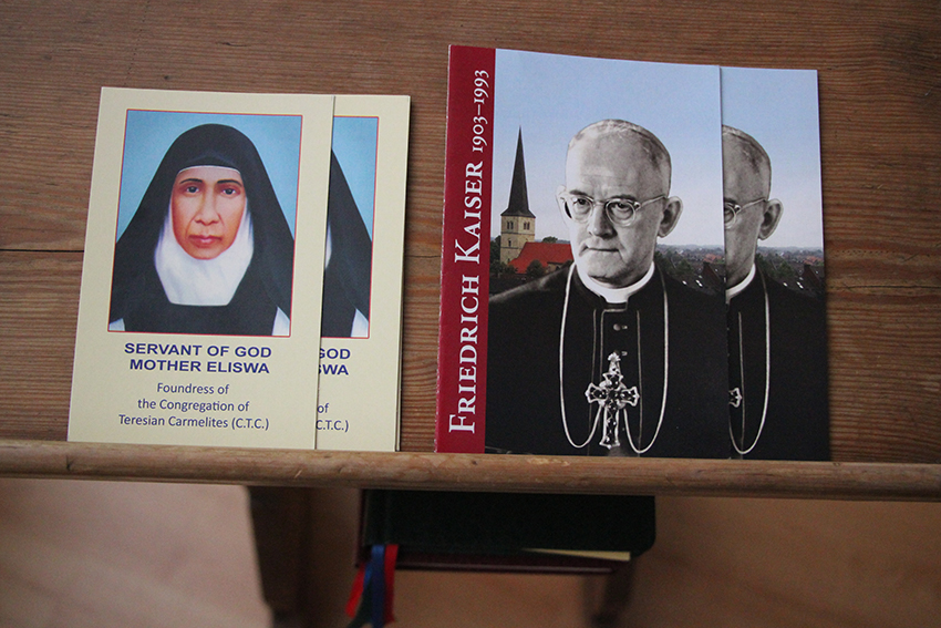 Wir verabschieden uns. Ich ziehe mich in die Hauskapelle zurück, um jetzt auch die Vesper zu beten. Die Kapelle mit neobarocken Anklängen wurde 1926 eingeweiht, war aber schon im Bau, als Friedrich Kaiser hier als Gast logierte. Eine große holzgeschnitzte Herz-Jesu-Figur steht seitlich des Altarraums, ihr gegenüber eine Marienfigur. Das holzgeschnitzte Altarrelief zeigt den „Gnadenstuhl“: Gottvater auf dem Thron hält den gekreuzigten Sohn in die Welt hinein. Das Herz Jesu am Kreuz wird später einmal zentrales Motiv des Bischofswappens von Friedrich Kaiser sein. Daran muss ich gerade denken, als mir ein Stapel Gebetszettel in den Blick kommt, schon zum zweiten Mal heute Nachmittag. Doch diesmal enthalten die Kärtchen keinen Geist-Hymnus, sondern ein Gebet um die Seligsprechung der Gründerin der „Theresianischen Karmelitinnen“ im indischen Bundesstaat Kerala, Mutter Eliswa (1831-1913). „Demütig flehe ich zu dir, die Dienerin Gottes, Mutter Eliswa, im Himmel und auf Erden mit deinem Glanz auszuzeichnen“, so lese ich im Gebetstext. „Du hast sie berufen, in inniger Nähe mit dir zu leben und deine Barmherzigkeit durch ihr Wesen und Wirken sichtbar zu machen: befreiende Liebe und Sorge für die Menschen, besonders für die Frauen.“
