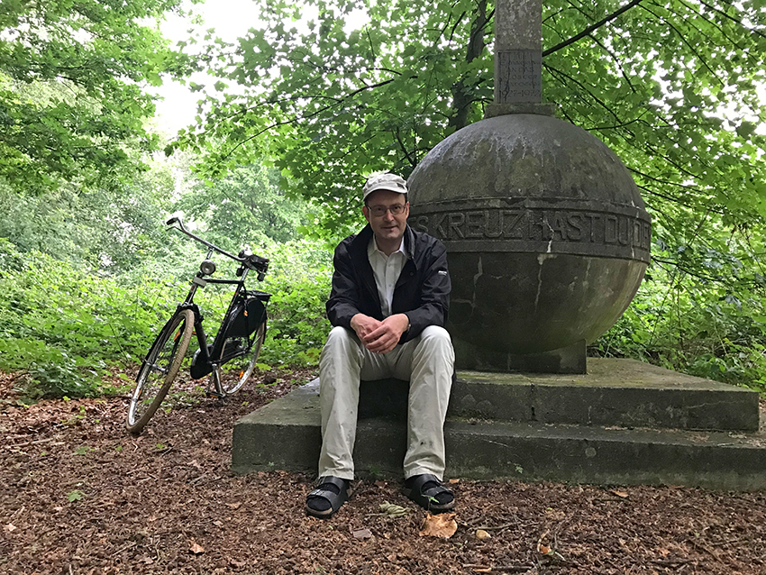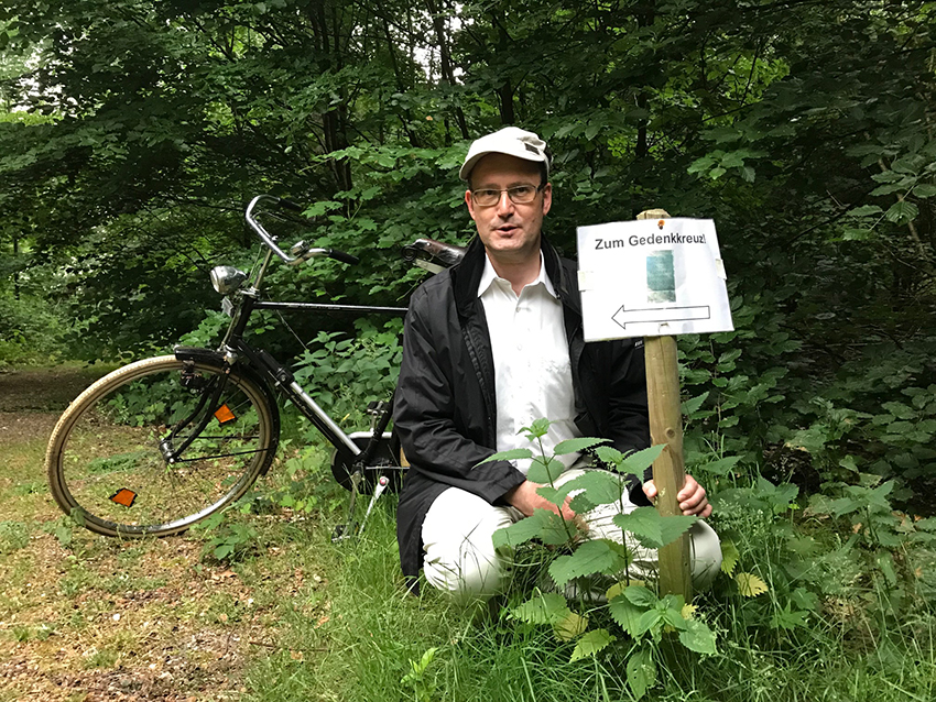 Ein paar Schritte weiter kommt mir ein Paar, mittleren Alters, mit einem Hund entgegen. Beide verstehen, was ich suche, waren selbst aber lange nicht mehr an dem Kreuz. Jedenfalls, so erfahre ich, soll sich das Gedenkkreuz nicht innerhalb, sondern außerhalb des Einrichtungsgeländes befinden. Ich bin erleichtert, denn heute ist ja rund um „Haus Freudenberg“ alles geschlossen und nicht zugänglich. Es entspinnt sich ein kleiner Disput zwischen den beiden, welchen Weg durch das Waldgebiet ich einnehmen müsse. Die Behauptung des Mannes, auf der von seiner Frau empfohlenen Strecke käme ich mit meinem Fahrrad überhaupt nicht durch, provoziert mich, ihrer Empfehlung zu folgen. Ich biege vom Fahrweg in einen Fußweg durchs Gehölz ein. Ein improvisiertes Schild, laminiertes Papier an einem Holzpflock, zeigt irgendwann einen Abzweig „zum Gedenkkreuz“ an; der Weg wird zum Trampelpfad, führt über Laub und unter mächtigen Buchen und Ahornbäumen her, durch ein Dickicht von Brombeergestrüpp, Farnkraut und Brennnesseln, entlang der Einzäunung der Behinderteneinrichtung.