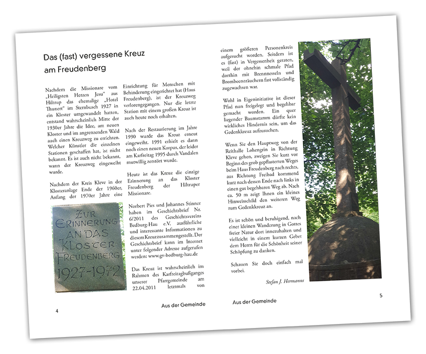 Erst in der Weihnachtsausgabe der Kirchengemeinde Bedburg-Hau war auf „das (fast) vergessene Kreuz am Freudenberg“ hingewiesen und für einen Besuch geworben worden: „Es ist schön und beruhigend, nach einer kleinen Wanderung in Gottes freier Natur dort innezuhalten und vielleicht in einem kurzen Gebet dem Herrn für die Schönheit seiner Schöpfung zu danken.“ Das will ich tun, hole das kleine Gebetsblatt aus der Antoniuskirche Hau hervor und singe leise den dort abgedruckten Hymnus zum Heiligen Geist: „Entflamme Sinne und Gemüt, / dass Liebe unser Herz durchglüht / und unser schwaches Fleisch und Blut / in deiner Kraft das Gute tut.“