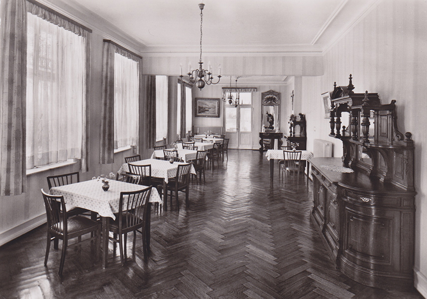 In der Hauskapelle sind drei Schwestern versammelt und haben offenbar soeben die Vesper beendet. Eine Ordensfrau, Schwester Georgia, kommt auf mich zu und begrüßt mich freundlich. Ich erkläre ihr in knappen Zügen, wer ich bin und was mich hierher treibt. Sie lädt mich ein, erst einmal einen Kaffee zu trinken, und ich folge ihr durch einen Flurbereich. An den Wänden hängen großformatige Abzüge historischer Schwarzweiß-Fotografien, die Szenen aus dem Leben auf Burg Ranzow seit dem Ersten Weltkrieg festhalten. Gern würde ich hier verweilen, doch Schwester Georgia erklärt, dass ich diese Bilder auch in einem Prospekt des Hauses finden könne. Durch das Erdgeschoss des Barockturms gelangen wir in einen Speiseraum. Da es schon nach 17.00 Uhr ist, wird gerade abgeräumt, doch die beiden diensthabenden Damen, Frau Reintjes und Frau Jansen, bringen wieselflink noch Kaffee und zwei köstliche Stücke Erdbeerkuchen herbei.