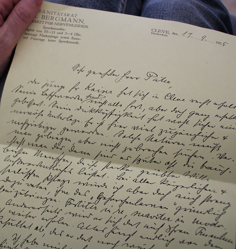 Die Regenwolken sind längst weg. Ich radle vom „Sternbusch“ aus knapp vier Kilometer nach Kleve-Materborn. Hier liegt unweit der Pfarrkirche St. Anna das frühere Herrenhaus „Burg Ranzow“. Durch einen weitläufigen Park, vorbei an einigen plaudernden älteren Damen auf einer Bank, erreiche ich den gläsernen Eingangsbereich der gepflegten Seniorenresidenz. Vor dem Ersten Weltkrieg hatte sich hier die Kölner Schwesterngemeinschaft der Cellitinnen niedergelassen, um in einer Art Sozialstation Dienste der ambulanten Krankenpflege bzw. der Alten- und Kinderbetreuung vorzuhalten sowie Haushaltungs- und Handarbeitskurse anzubieten. Der barocke Bau mit einem markanten achteckigen Türmchen wurde in den letzten Jahrzehnten mehrfach umgebaut und erweitert. Anfang der 1920er Jahre gewann das Haus mehr und mehr den Charakter eines Sanatoriums, der schon erwähnte Dr. Bergmann wurde ärztlicher Direktor. Bergmann, der sich auch „Chefarzt für Nervenleiden“ nannte, war ein origineller Mensch und innovativer Psychotherapeut: Als junger Arzt hatte er bei dem berühmten Pfarrer Sebastian Kneipp in Wörrishofen assistiert und war ab den 1890er Jahren mit Wasserkuren in „Bad Cleve“ erfolgreich. Mit seinem „ganzheitlichen Ansatz“ kümmerte sich Bergmann um Menschen mit psychischen Befindlichkeitsstörungen, also Depressionen oder Erschöpfungszuständen; nebenbei publizierte er zahlreiche Aufsätze und Vorträge zum Thema „Religion und Seelenleiden“. Auch Geistliche und Ordensleute, sogar Bischöfe wussten das damals populäre Naturheilverfahren zu schätzen – und so erhielt auch Friedrich Kaiser den entscheidenden Tipp.