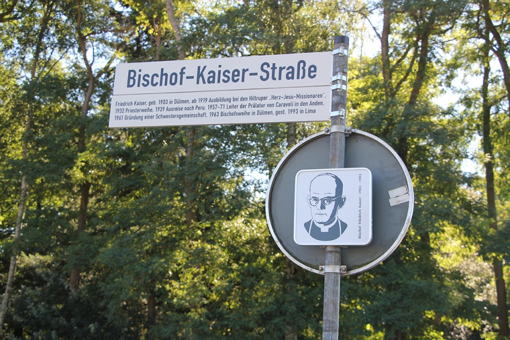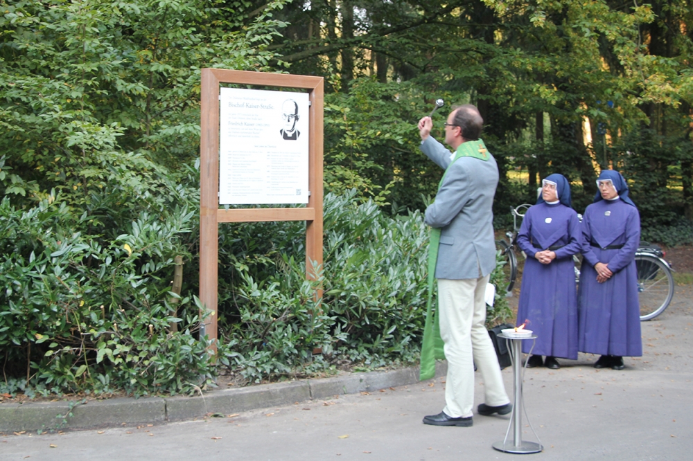 Segnung des neuen SchildesIch gehe die Bischof-Kaiser-Straße bis zum Haupteingang des Waldfriedhofs. Der Waldfriedhof wurde im November 1928 eröffnet. Auch Friedrich Kaisers Vater Josef wurde knapp zehn Jahre später hier bestattet. – Auf dem vorgelagerten Parkplatz wurde am 26. August 2016 eine 80 x 80 cm große Info-Tafel im Beisein peruanischer Ordensfrauen aus der von Kaiser gegründeten Gemeinschaft der „misioneras de jesus verbo et victima“ enthüllt, die eine ganze Reihe von Informationen zum „Namenspatron“ der „Bischof-Kaiser-Straße“ bietet. Im Internet kursiert bei „YouTube“ ein Mitschnitt von diesem Ereignis: Schwester Inmaculata und Schwester Flavia besingen zunächst in einem spanischsprachigen Volkslied ihre peruanische Heimat mit den drei großen Regionen Küste, Anden und Regenwald; dann zieht Schwester Flavia die Verhüllung von der neuen Tafel. Das Segensgebet, das ich damals sprach, lautete: „Herr Jesus Christus! Wir alle sind zum Zeugnis für dein Evangelium berufen. Wir alle dürfen etwas von der Schönheit und Wahrheit deiner Botschaft aufstrahlen lassen. Hilf uns, dass wir als Getaufte in diesem Sinne einander wahrnehmen und aufeinander zugehen. Hilf uns die Erinnerung an jene wachzuhalten, die uns als glaubwürdige Christen ein Beispiel gegeben haben, deinem Ruf zu folgen. Lass uns insbesondere im Lebens- und Glaubenszeugnis deines Dieners Friedrich Kaiser Anregungen für unser persönliches Christsein und für unser Leben als Gemeinde vor Ort entdecken. Schenke uns und allen, die an diesem Bild und vor dieser Tafel verweilen, Orientierung im Glauben sowie die Kraft und den Mut, selbst aufzubrechen und uns von dir in den Dienst nehmen zu lassen – heute und an allen Tagen unseres Lebens bis in Ewigkeit. Amen.“