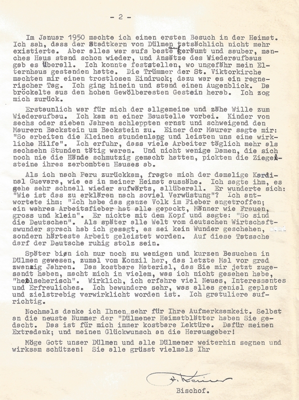 Als dieser Bildstock und ganz Dülmen 1945 zerstört wurde, war Friedrich Kaiser schon einige Jahre im fernen Südamerika. Erst kürzlich wurde ich durch den Vorsitzenden des Dülmener Heimatvereins, Erik Potthoff, auf einen über 30 Jahre alten Brief aufmerksam gemacht, den Bischof Kaiser am 15. Oktober 1986 an den Heimatverein adressiert hatte, in dem sich einige interessante Hinweise finden, wie Kaiser Krieg und Zerstörung Dülmens wahrgenommen hat. Ich krame eine Fotokopie dieses Briefes hervor, die bereits für eine noch nicht stattgefundene Gruppenführung angefertigt ist, denn das Original ist auf hauchdünnem und empfindlichem Durchschlagpapier geschrieben. Ich lasse Kaiser selbst zu Wort kommen: „Im März 1939 reiste ich aus nach Peru. Fünf Monate später brach der Krieg aus. Damit waren wir von aller Verbindung mit der Heimat abgeschnitten. In der Zeitung von Lima erschien täglich der Heeresbericht sowohl der Deutschen wie der Alliierten. So konnten wir die Kriegsgeschehnisse ganz gut verfolgen.“