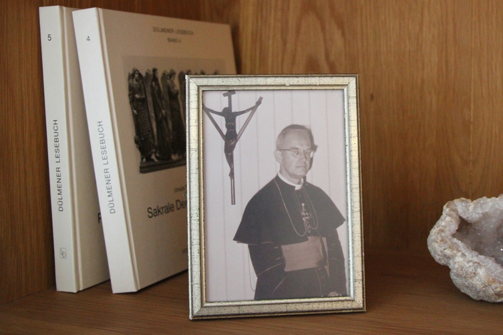 Foto vom HeimatbesuchNoch bevor wir Platz nehmen, entdecke ich in einem Regalfach ein kleineres, mir schon von früheren Besuchen bekanntes Foto: Es zeigt Friedrich Kaiser anlässlich eines Heimatbesuchs in den 1960er Jahren in einer Wohnung von Verwandten vor einem Wandkreuz, dem „Coesfelder Kreuz“. Das berühmte Gabelkreuz aus dem Mittelalter bzw. dessen vielfältige Nachbildung war lange Zeit so was wie ein „Emblem“ des münsterländischen Katholizismus, befand sich als Miniaturkopie in zahllosen Haushalten und kirchlichen Einrichtungen im Münsterland. Erst vor kurzem kam von den peruanischen Schwestern des von Kaiser gegründeten Seelsorge-Ordens die Anfrage und Bitte, einige „Coesfelder Kreuze“ zu schicken, damit sie künftig in Einrichtungen und Diensträumen der Ordensfrauen ihren Platz fänden – und an die ferne Heimat des Gründers erinnern. So bedauerlich es ist, dass das „Coesfelder Kreuz“ als religiöses „Markenzeichen“ des Münsterlandes zunehmend aus dem Blick gerät: so schön ist der Gedanke, dass diese Kreuze im fernen Südamerika eine neue Wertschätzung und Verehrung erfahren.