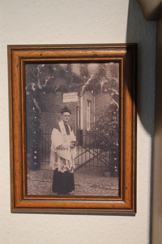 Foto am Tag der PrimizWir plaudern ein wenig, über das Leben im Heilig-Geist-Stift, über Gott und die Welt – und natürlich über „Onkel Fritz“. Elli Frieling ist eine liebenswürdige Person und gibt bereitwillig Auskunft. Dass sie sich ab und zu wiederholt, erspart mir Nachfragen und erleichtert mir auch, einige Notizen zu machen. Dann springt mir ein weiteres, mir ebenfalls nicht ganz unbekanntes Foto ins Auge, ungefähr Postkartenformat, gerahmt und an die Wand gehängt. Wir haben das Bild schon beim ersten Dülmen-Rundgang von Frau Alfs in der Tiberstraße erläutert bekommen. Es zeigt den Neupriester Friedrich Kaiser am Tag seiner Heimatprimiz vor dem Elternhaus, bekleidet mit Talar und Rochett, angetan mit Stola und Birett. Damals war seine Nichte Elli dreieinhalb Jahre alt, doch einige „Gedächtnisspuren“ führen bis heute zu dem großen Tag zurück. Dass die kleine Elli zum Primizgottesdienst nach St. Viktor mitgenommen wurde, will sie heute nicht beschwören. Sicher aber erinnert sie sich, wie am Nachmittag der Neupriester seine kleine Nichte zu sich rief und sie sich vor ihm hinstellte, worauf er ihr erklärte, dass sie jetzt von ihm den Primizsegen erhalte, und dass er ihr dann die Hände aufgelegt habe. Elli Frieling hat  diesen Augenblick als ernst und feierlich und sehr schön in Erinnerung behalten. Auch den üppigen Blumen- und Straßenschmuck dieses Tages hat sie noch vor Augen.
