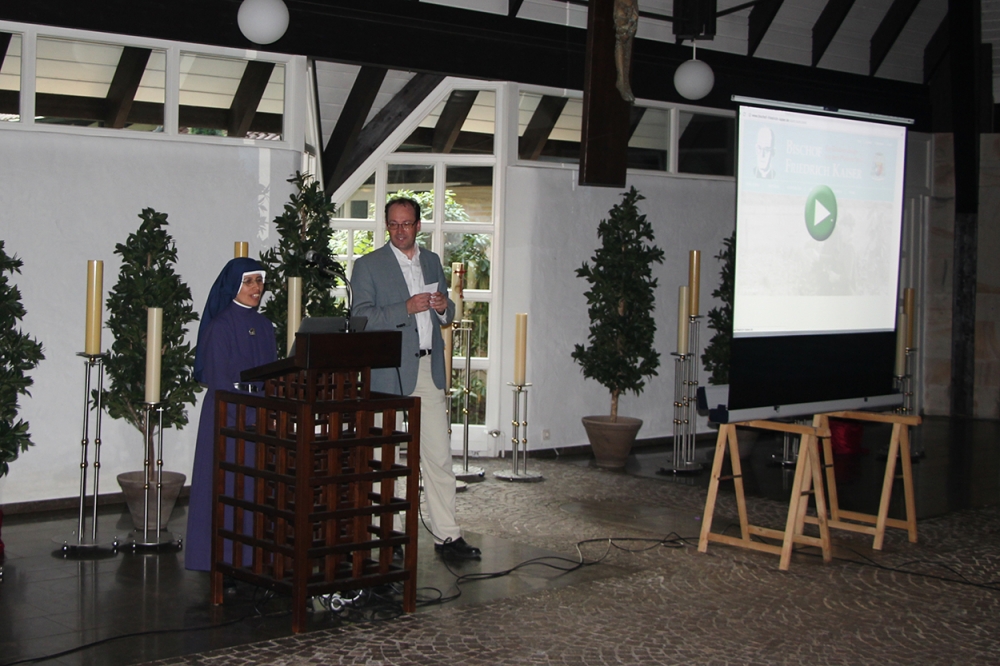 Freischaltung der WebsiteDanach sind wir, rd. 60 Personen, durch das Friedhofstor geschritten, um uns in der Trauerhalle zu versammeln. Hier war alles vorbereitet, um in einem weiteren kleinen Festakt einen Internet-Auftritt freizuschalten, der sich dem Andenken an Friedrich Kaiser widmet. Da Schwester Flavia die Enthüllung der Info-Tafel vorgenommen hatte, war jetzt Schwester Inmaculata an der Reihe und drückte den „Buzzer“, den roten Startknopf. Unter der Adresse www.bischof-friedrich-kaiser.de können auf einer von Christiane Daldrup erstellten und betreuten Internetplattform historische Texte und Bilder, aber auch aktuelle Informationen über das Wirken der von Kaiser gegründeten „misioneras“ oder über den Verlauf des Seligsprechungsverfahrens abgerufen werden.