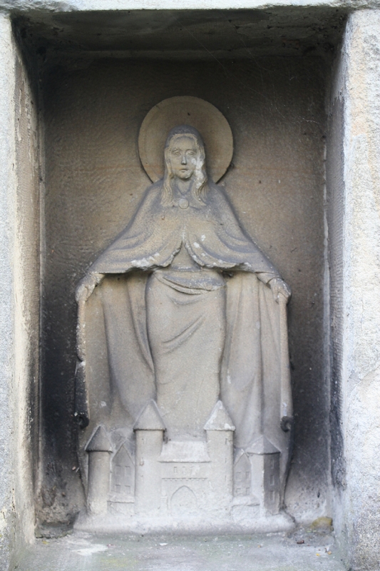 BildstockSeit jeher ist diese Stelle dieses Bildstocks der Punkt, an dem die neuen Pfarrer von St. Viktor begrüßt und „eingeholt“ wurden. In einer Nische sehen wir die Gottesmutter Maria, die ihren Mantel schützend über die Dächer und Häuser von Dülmen breitet. Wir erkennen den Nonnenturm und den Lorenkenturm (oder ist der im Krieg zerstörte Tiberturm ganz in der Nähe von Friedrich Kaisers Elternhaus gemeint?) sowie, genau in der Mitte unterhalb der Muttergottes, die markante Silhouette des Lüdinghauser Tors. Hier hätte der Steinmetz, wäre der Bildstock vor dem Ersten Weltkrieg entstanden, den kleinen Fritz Kaiser verewigen können, der jeden Morgen über die Lüdinghauser Straße zur Josefschule marschierte, die ungefähr hinter der heutigen Post lag. Aber der jetzige Bildstock ist ja gar nicht so alt, ist schon das „Nachfolgemodell“ eines früheren. Auf der Rückseite lässt sich eine schon stark verwitterte Inschrift entziffern: „Zerstört 1945 / Wiedererrichtet 1950“