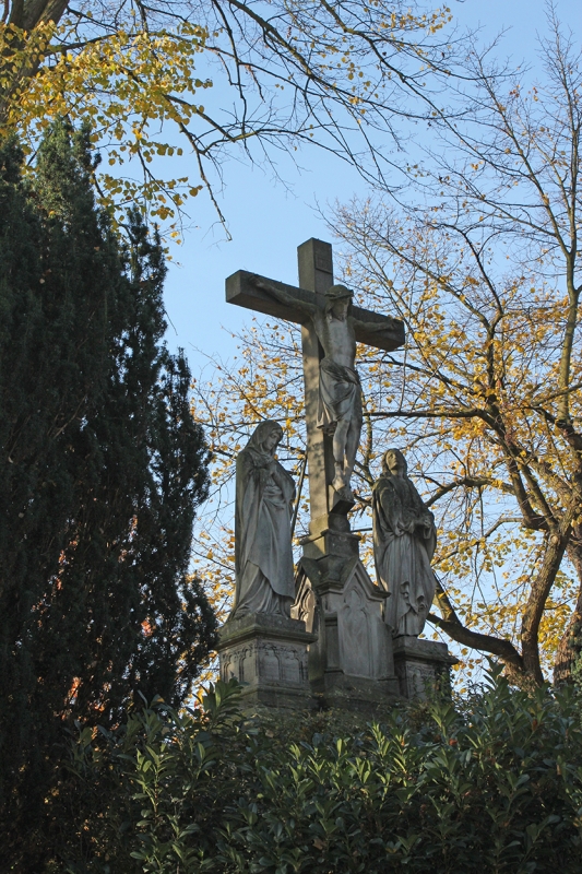KreuzigungshügelEtwas abseits von den honorigen Grabmälern tummeln sich auf der frisch geschnittenen Rasenfläche zahllose Kaninchen in der Abendsonne. Mein Ziel ist der am hinteren Ende des Friedhofs zentral gelegene Kreuzigungshügel: Aus mächtigem Kirschlorbeer-Gesträuch ragt das aus Sandstein geschaffene lebensgroße Kruzifix empor, links und rechts unter dem Kreuz stehen die Mutter Jesu und der Lieblingsjünger Johannes. Am Fuße dieses aufgeschütteten „Golgatha“, so weiß ich von früheren Besuchen, befinden sich rd. ein Dutzend Grabplatten verstorbener Dülmener Priester, zum Rasen hin im Halbkreis angeordnet. Sie scheinen alle mehr oder weniger vom Winde versandet worden zu sein, doch bei genauerem Hinsehen wird mir die eigentliche Ursache klar: Offenbar haben ganze Arbeitskolonnen von Kaninchen gleich an mehreren Stellen zwischen knorrigem Wurzelwerk eindrucksvolle Tunneleingänge im Kreuzigungshügel angelegt – und infolgedessen ganze Abraumhalden von Sand auf den Grabtafeln der Geistlichkeit verursacht.