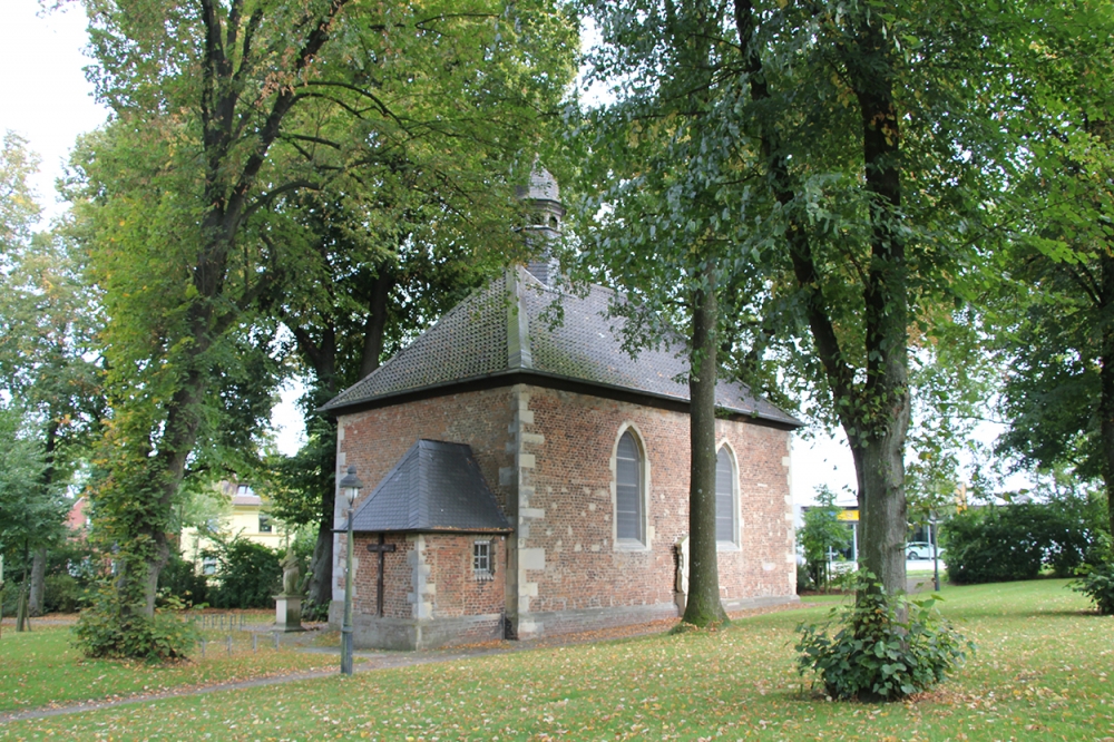 KreuzkapelleVor dem Ende der Welt ist das Ende des Tages nahe. Die abendliche Sonne ist inzwischen verschwunden, die Dämmerung hat sich über die Wege und Grabfelder unseres Waldfriedhofs gelegt. Mich fröstelt ein wenig. Ich begebe mich zum Eingang, ziehe das Fußgängertor hinter mir zu, entbiete dem ernst dreinblickenden Konterfei Friedrich Kaisers auf der Info-Tafel am Parkplatz einen stillen Gruß. Dann wandere ich durch die anbrechende Nacht, vorbei an der Kreuzkapelle und der Kreuzkirche, durch das Lüdinghauser Tor, an St. Viktor und dem Marktplatz vorbei über die Coesfelder Straße nach Hause.
